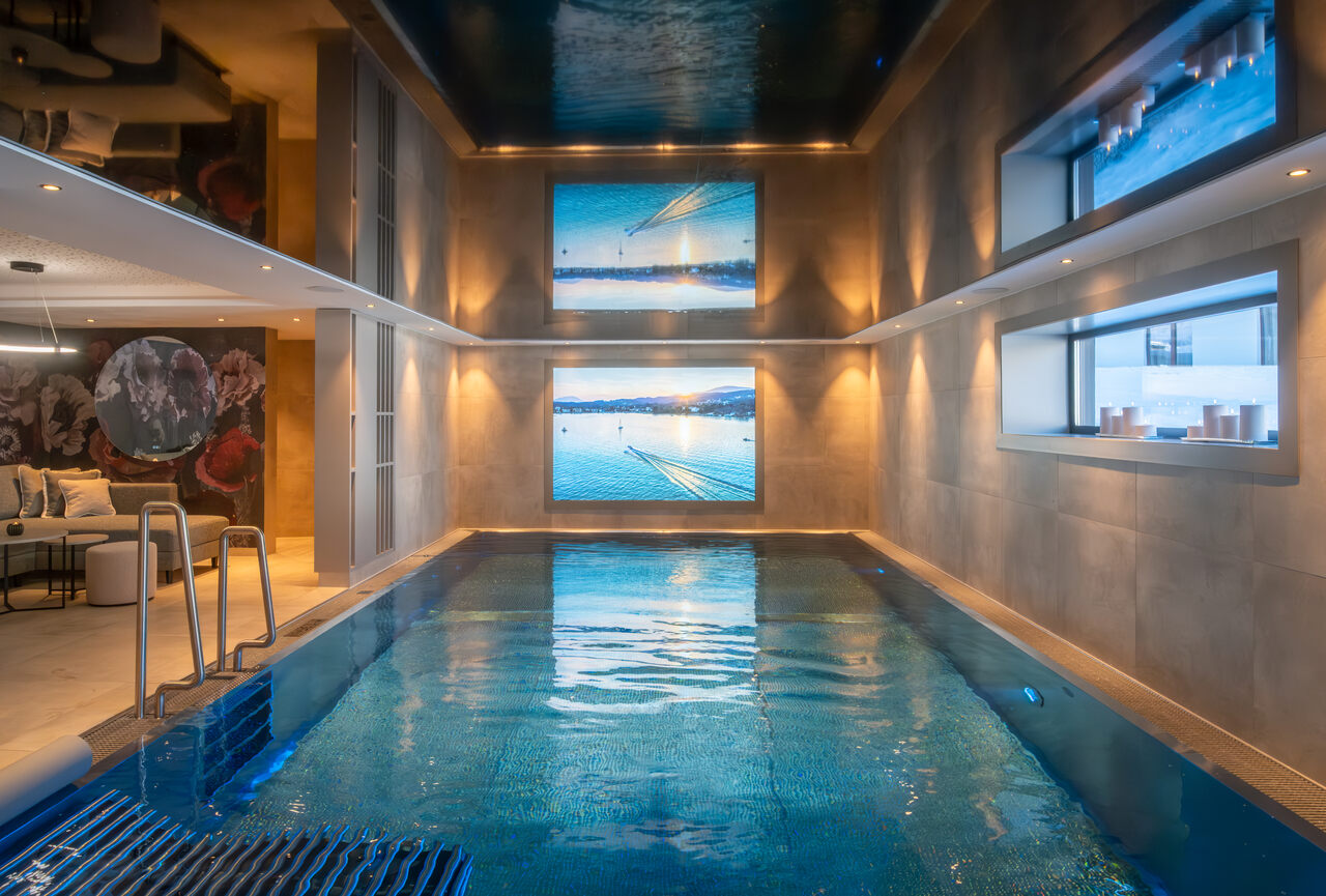 Unser neuer Indoor-Pool – ein Ort für schwereloses Gleiten, sprudelnde Entspannung und alpine Ruhe - und das alles mit Blick auf den Wörthersee.